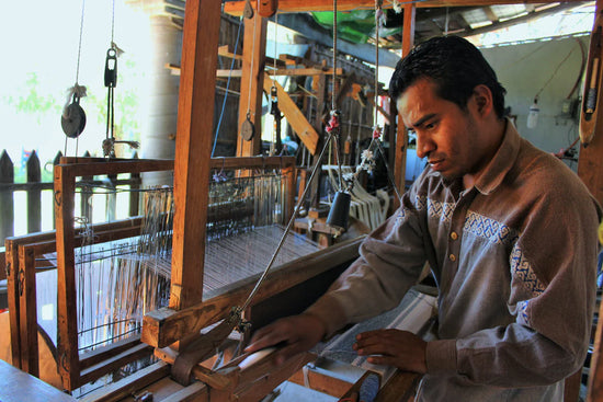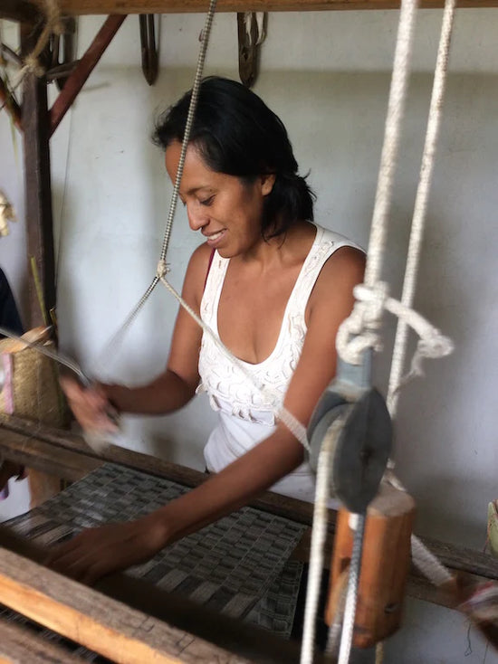 Carmen and her husband José collaborate with Abrazo to create virtually all of our hand woven products. She comes from a long line of weavers in Mitla, Oaxaca. It is relatively rare for women to weave on the pedal loom due to its physicality. Here she is weaving our Carmen scarf.