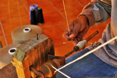 José is filling spindles with thread, used in the weaving process. They combine thread colors to create unique tones and effects in the weaving.