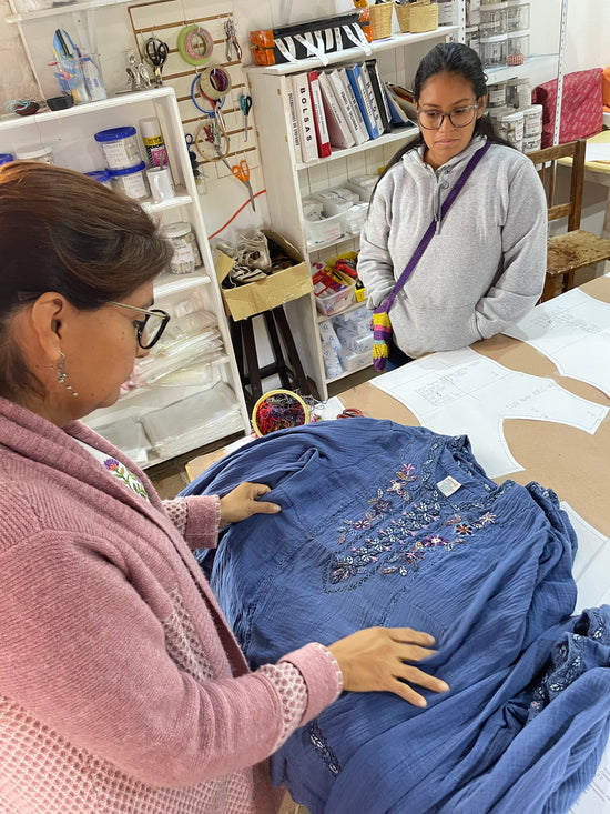 When artisans complete their work it is delivered to Eugenia, "la reina" of quality control. She carefully checks each piece and returns to the maker anything that does not meet our standards to be redone. After approval, apparel is washed, ironed, tagged, and packaged for export.