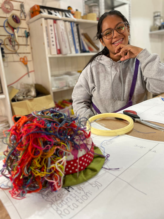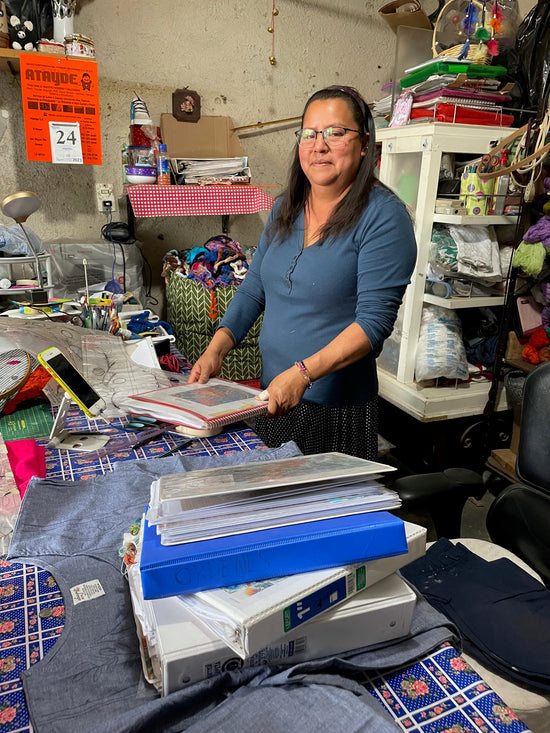 Paty is one of the cornerstones of Abrazo. She was an embroidery student in our workshops before Abrazo officially came to be. Now, she is our head embroidery manager in charge of making drawings on paper come to life on fabric. This is her studio at home with books of Abrazo designs and color keys.