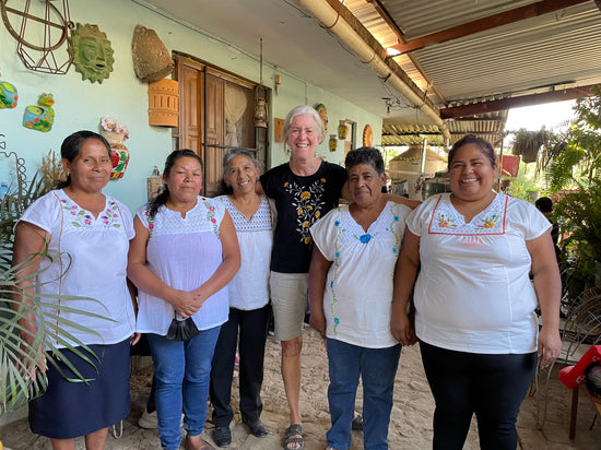 A gathering with some of the women we work with in Oaxaca. Each was given an Abrazo blouse to embroider in their own design...a very fun project.