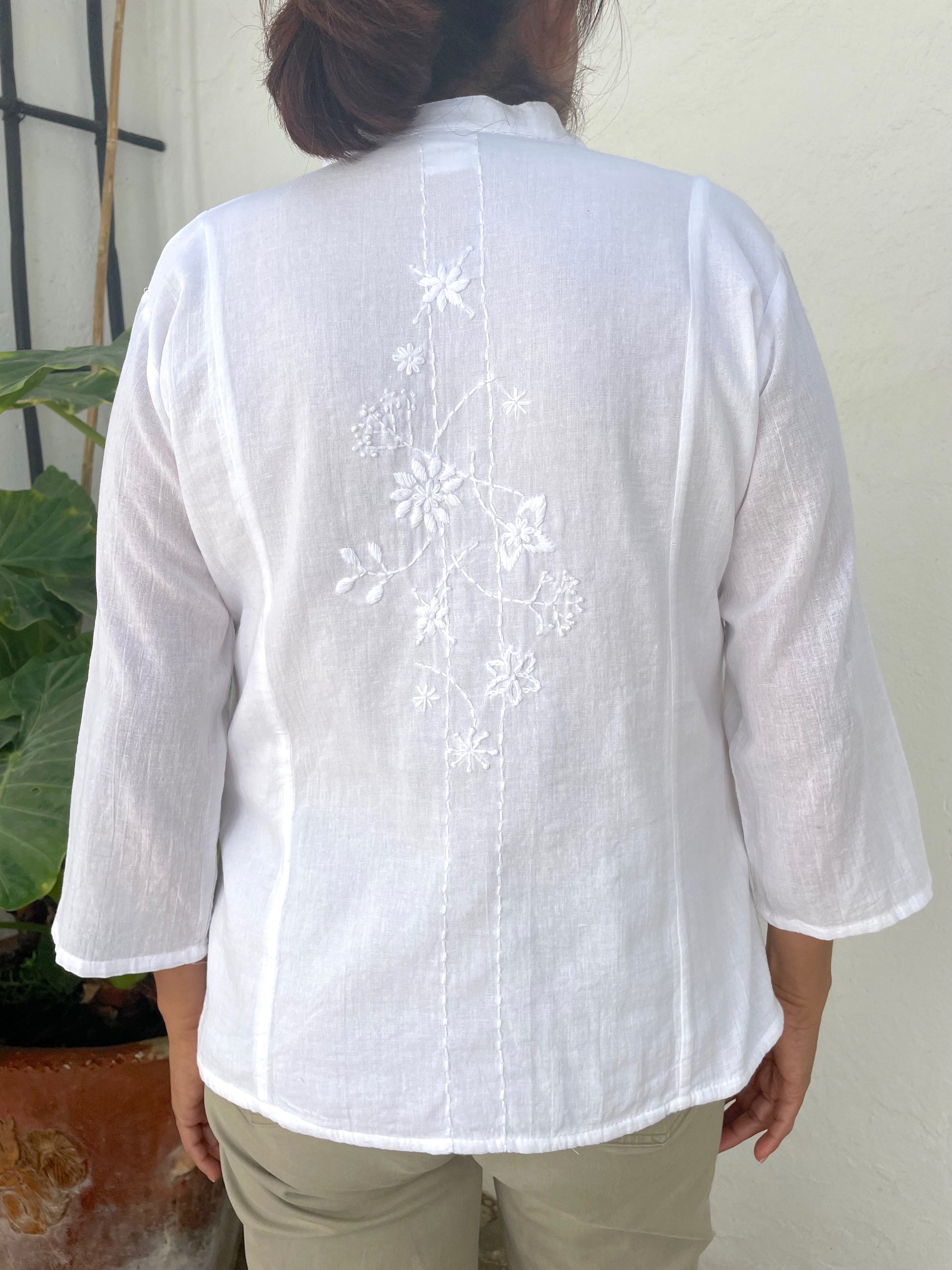 Delicate sprigs of meadow flowers cascade down the front and back of our Alba blouse. Sewn from 100% light weight airy cotton, the Alba features a double panel fabric in the body for modesty and a sheer single panel sleeve for a touch of elegance. With simple, beautiful styling, this easy fit, two button blouse with 3/4 sleeves is a summer favorite. Pre-washed. Fair trade verified. Model is 5'8"