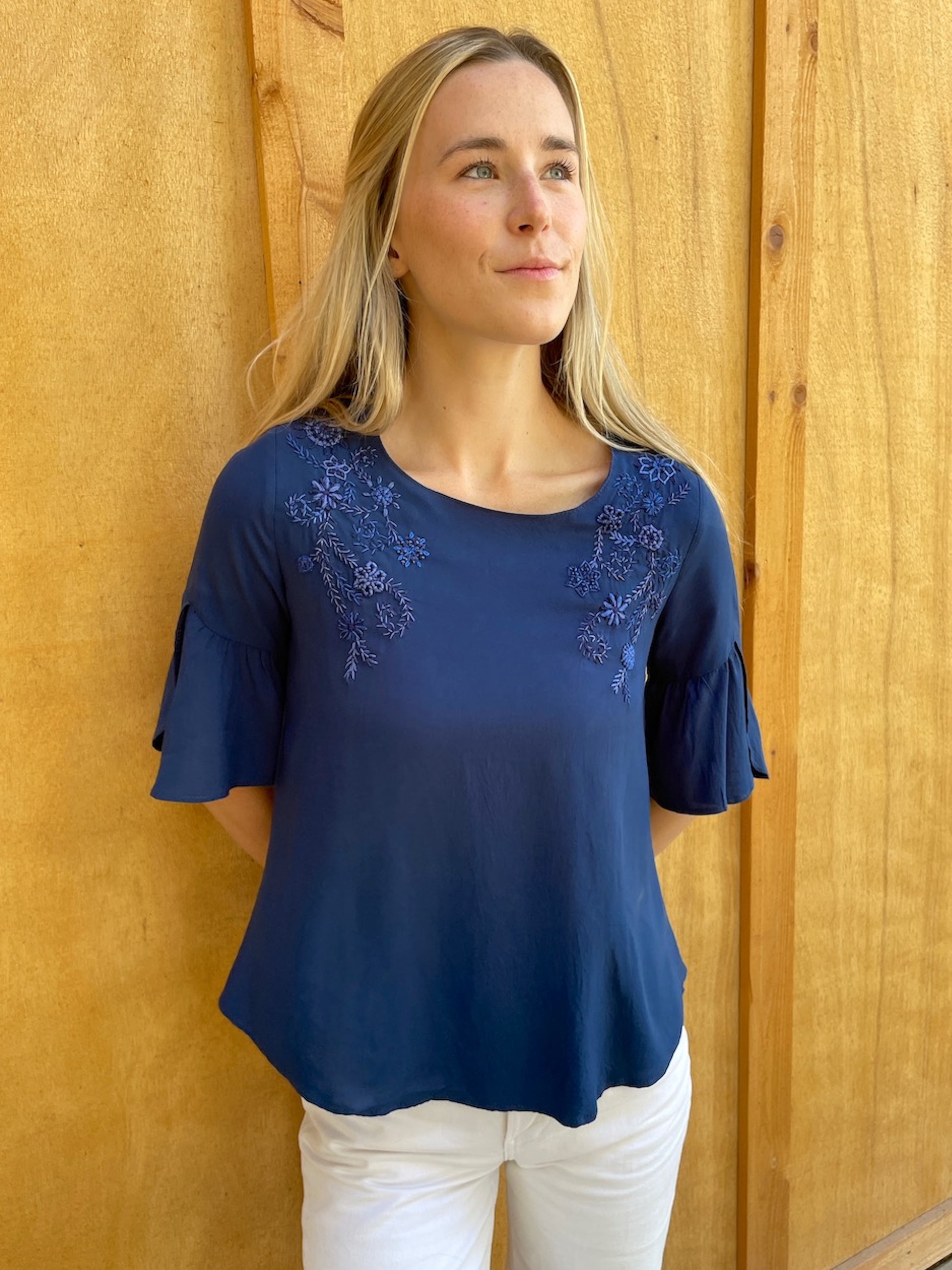 Handcrafted in a sumptuous silky rayon, the Angelina features an easy slip on fit with petal bell sleeve, curved hemline, keyhole button back, and rich hand embroidered details on the front. Pre-washed, machine washable. Fair trade verified. Model is 5'9" size small