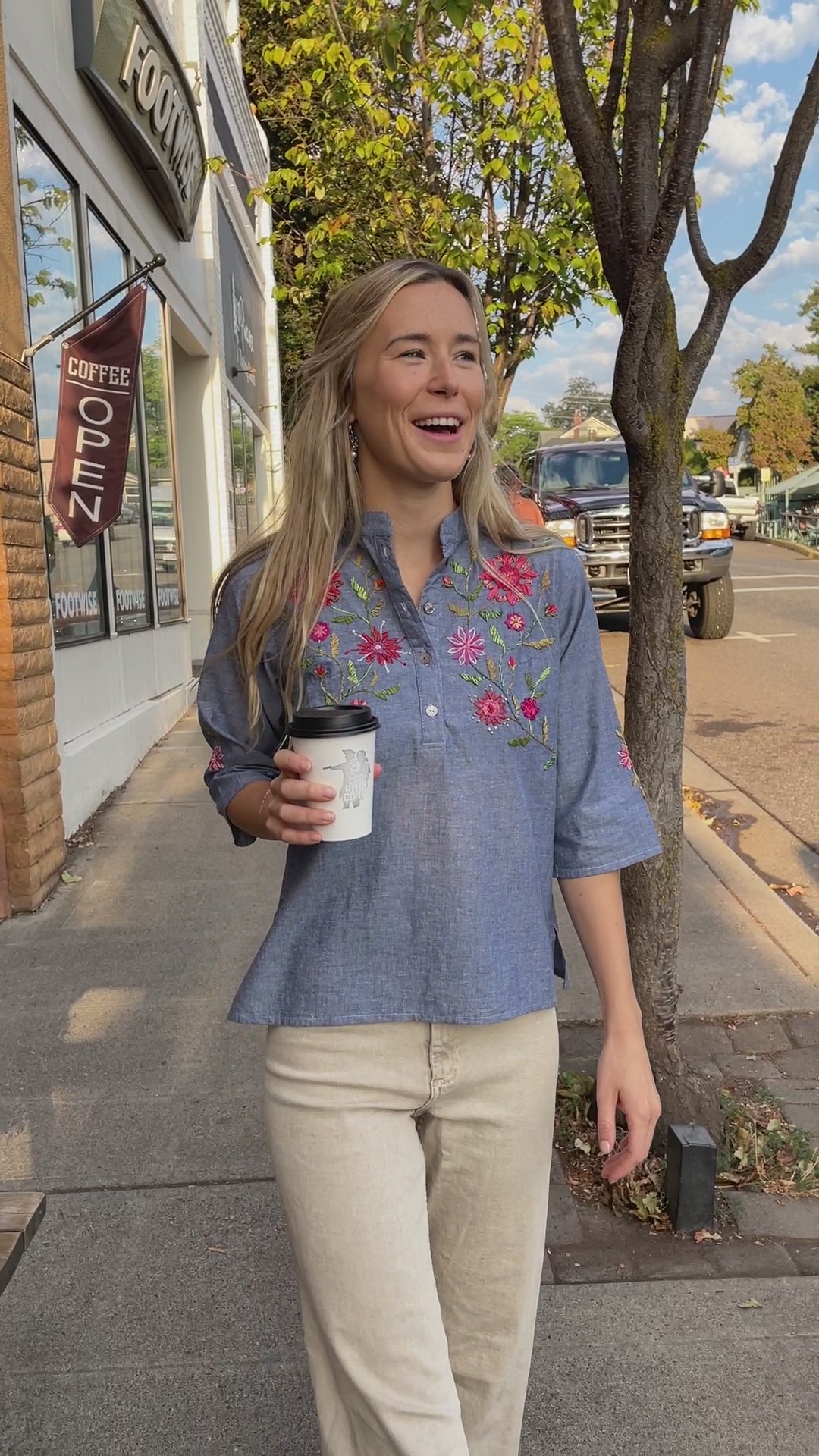 Made from 100% cotton chambray, the Ramona is a delightful work of wearable art for work or play. Offering a casually tailored fit with slip on button front, 3/4 sleeves, side slits, and beautiful hand embroidered floral details across the bodice, and the sleeves. Pre-washed and machine washable. Fair trade verified. Model is 5'9", size small.