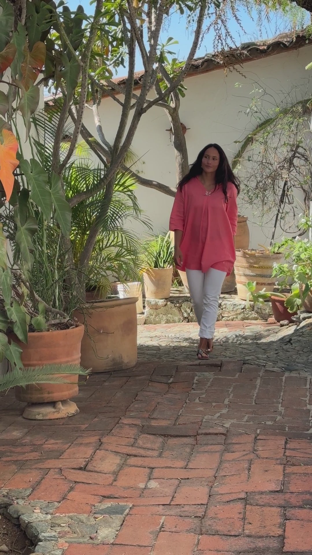 The Daniela tunic offers a lusciously soft linen/rayon blend with simple yet elegant tailoring. Designed for a breezy, loose fit, the Daniela features general, paired sizing for fitting a wider range of shapes. Hand embroidered details are stitched at the neck and around the base of the tunic. 3/4 length sleeves, side seam pockets, and lovely pleats in front and back make this tunic a flattering choice. Pre-washed. Fair trade verified. Model 5'7"