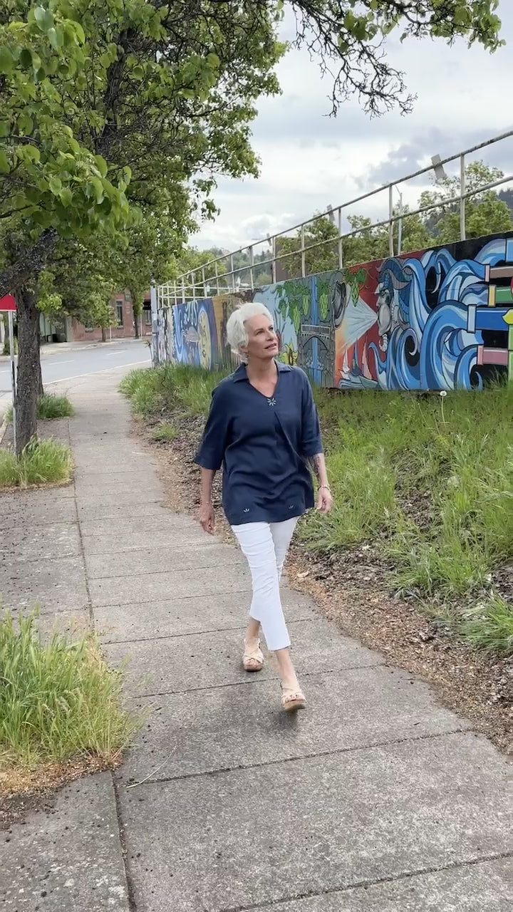 The Daniela tunic offers a lusciously soft linen/rayon blend with simple yet elegant tailoring. Designed for a breezy, loose fit, the Daniela features general, paired sizing for fitting a wider range of shapes. Hand embroidered details are stitched at the neck and around the base of the tunic. 3/4 length sleeves, side seam pockets, and lovely pleats in front and back make this tunic a flattering choice. Pre-washed. Fair trade verified. Model 5'10"